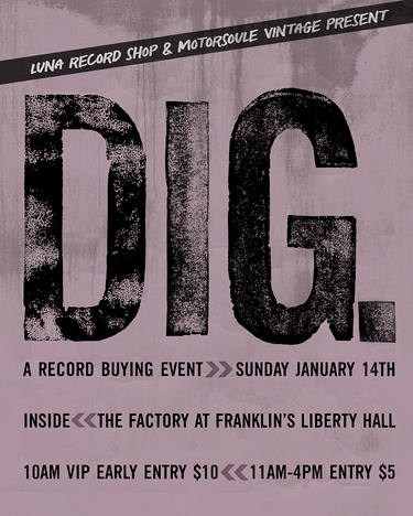 A Record Buying Event taking place in The Factory At Franklin's Liberty Hall! Up to 14,000 square feet of records to dig through. Right down the hall from Luna! Hosted by Luna Record Shop and Motorsoule Vintage, plus you will find local vendors along with many other vendors from all over the south!